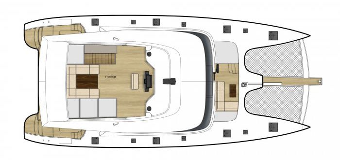 The flybridge is accessed via the main deck cockpit via a staircase. As well as offering elevated views of the surroundings, there is a forward helm station a row of sunpads on the starboard aft and a C-shaped seating area along the stern, shaded by a hardtop cover and complete with table for alfresco dining.