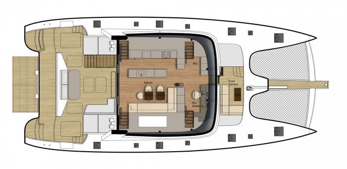 On the foredeck there is a small terrace ideal for candlelit dinners between two, or as a place to read and relax out in the sunshine. On the bow, there are two trampolines that make excellent spots for sunbathers to listen to the ambient sounds of the water underneath, while taking in the scenery.